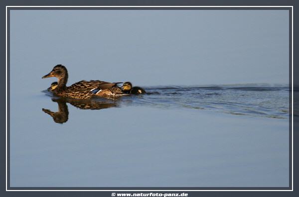 Häufigste Schwimmente. Prachtkleid des Männchens charakteristisch mit grünschillerndem Kopf und Hals, gelbem Schnabel, weißem Halsring, schokoladenbrauner Brust und metallisch blauem Flügelspiegel. Im Schlichtkleid außer dem grünlichgelben Schnabel weibchenfarben : gelblichbraunes Gefieder mit dunkelbraunen Flecken, Flügelspiegel gleich.